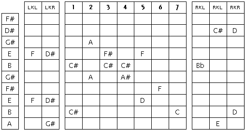 | As you can see, string 9, low D, is removed, the lower B-string went to place 9 and a A came instead of the lower B-string. These changes and setup make it possible to play almost any kind of music. For the countrymusic is the complete range of E9 available. When I'm playing blues or Western Swing or Rock or jazz, then I push my LKR and keep it so and here we go, even in the middle of a song. I find it very comfortable, that I can change my style of playing and accompanying with pushing just one pedal. |